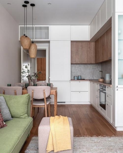 При разработке дизайна интерьера были приняты во внимание интересы каждого ребёнка. Для малыша в спальне родителей установили кроватку, а для сына - подростка обустроили отдельную комнату с хорошей звукоизоляцией. Общая площадь квартиры составляет 67 квадратных метров. Дизайн Lina Savina разработан.
