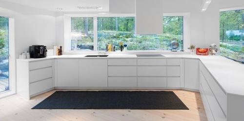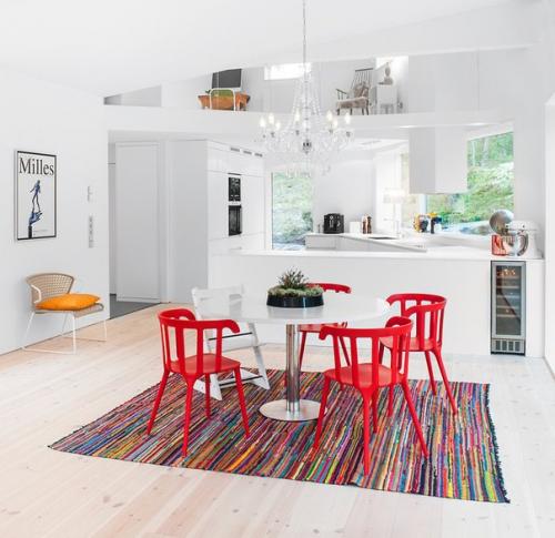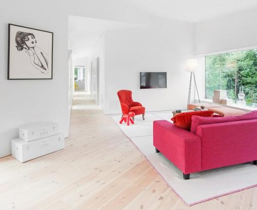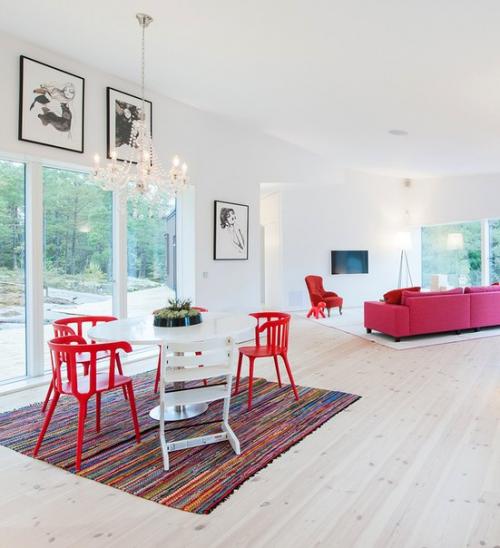 Спокойный и равномерно черный фасад дома контрастирует с интерьером, оформленным в белоснежной гамме с яркими акцентами. Функциональная планировка резиденции направляет от общей зоны к спальной и выполнена в соответствии с видами, открывающимися из окон той или иной комнаты. Тут нет ничего лишнего, все помещения в равной степени важны в использовании в повседневной жизни.