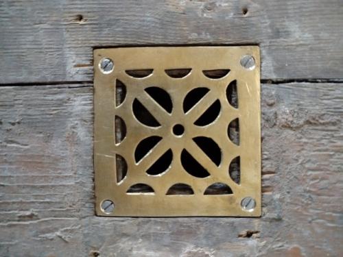 Не стал исключением и дом кустаря. Здесь решётка из толстого латунного листа изготовлена. Она литая а не штампованная как часто бывает и имеет отверстия в виде декоративного крестообразного рисунка. Рисунок этот довольно редкий и в широком ассортименте антикварных вещей практически не встречается. Поэтому в будущем, чтобы восполнить утраченные решётки, их необходимо будет заказывать на производстве и делать из аналогичного материала.