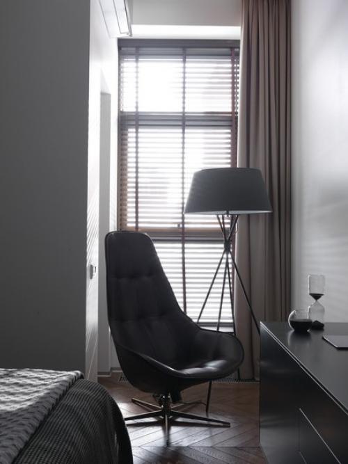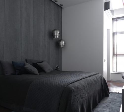 Изначально в проекте спальни было предусмотрено изголовье и облицовка деревянными рейками. Но в процессе реализации автор решила отказаться от этих решений и оформить стену керамогранитом. Вертикальные каменные панели добавили интерьеру спальни брутальности.