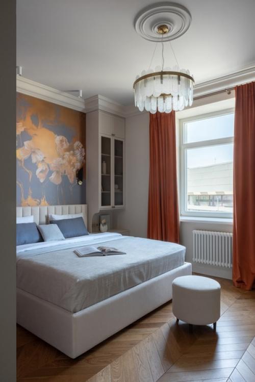 Дизайнер Ольга Воронкова сделала интерьер квартиры в новостройке эффектным и уникальным с помощью акцентных панно, красивой мебели и цветного декора. Визитной карточкой квартиры в новостройке площадью 97 кв. м на петроградской стороне стали эффектные обои с крупным рисунком, бордовая перегородка между кухней и гостиной и глубокий синий цвет прихожей. План квартиры будет в комментариях.