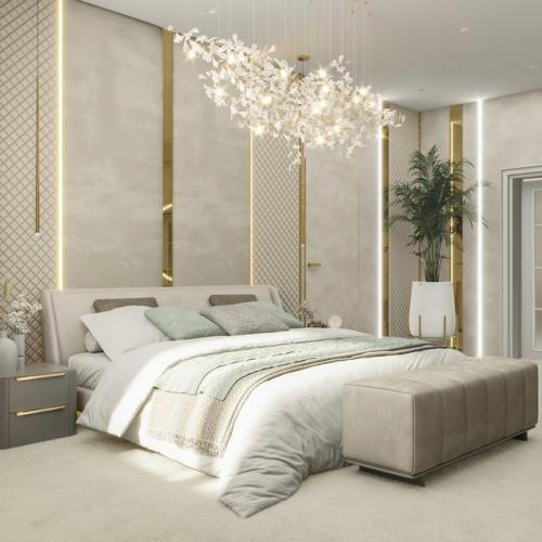 Сейчас представляю интерьер мастер - спальни в этом же доме для супружеской пары. Просторная спальня с личной гардеробной и собственной ванной комнатой. О чем еще можно мечтать? Нежные пастельный тона декоративной штукатурки, мягкое изголовье, золотые детали и акцентный цвет в оттенке "Зеленое Море" плавно переходящий в ванную комнату супругов. Одним из главных пожеланий было большое количество сценариев освещения. Шикарная люстра, точечные светильники, подвесные светильники для каждого из супругов, световые линии и зеркало с подсветкой - все это дает вариантивность для разных ситуаций и времени суток.