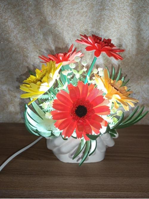 2. светильник "Букет Гербер в Ладонях" с уникальным дизайном кашпо в виде рук и яркими жизнерадостными цветами - жёлто - оранжево - красными. Высота композиции - 23 см, а диаметр цветов - 10 см.