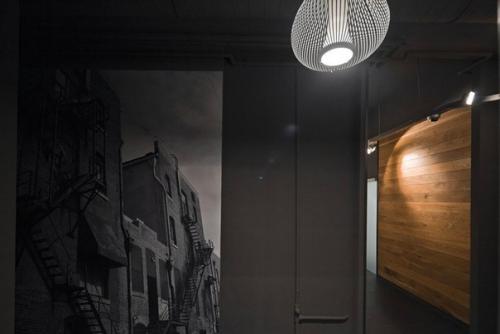 В интерьере доминирует темная цветовая гамма. На фоне черных и темно-серых стен контрастно выделяются светлые и кирпичные вставки, а также дубовый паркетный пол. Стальные балки под потолком и необычные светильники от Artemide Tolomeo формируют особый характер помещения. А благодаря дизайнерской мебели от Ronan.
