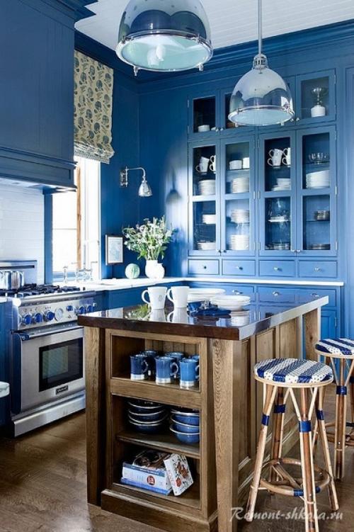 Синий цвет в классификацию холодной гаммы цветов входит. Холодные тона успокаивают, создают ощущение прохлады. Только в том случае, если же синий сочетается с яркими теплыми цветами, то возникает иная атмосфера - свежести, лета, радости. Используя различные сочетания синего и его вариантов с другими цветами можно создавать совершенно разный дизайн кухонь .