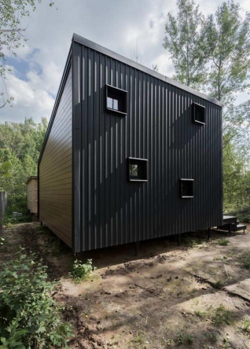 . На боковом фасаде - маленькие окна - бойницы, позволяют проветривать помещение и скрыться от любопытных глаз соседей. Дом рассчитан на семью с двумя детьми, но может вместить дополнительно двух гостей. Минидом@Tinyhouse.