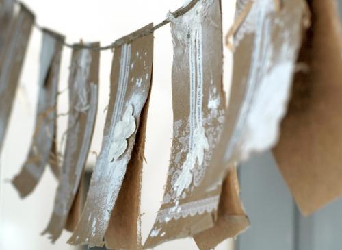 Чтобы дополнять мою комнату, надо сначала её освободить. Но флажки я всё равно сделала. Из упаковочного крафта. Нанесла при помощи штампов белые кружева, добавила белые пятна спреем. Немного кружева, мятых цветочков, кусочков ткани.