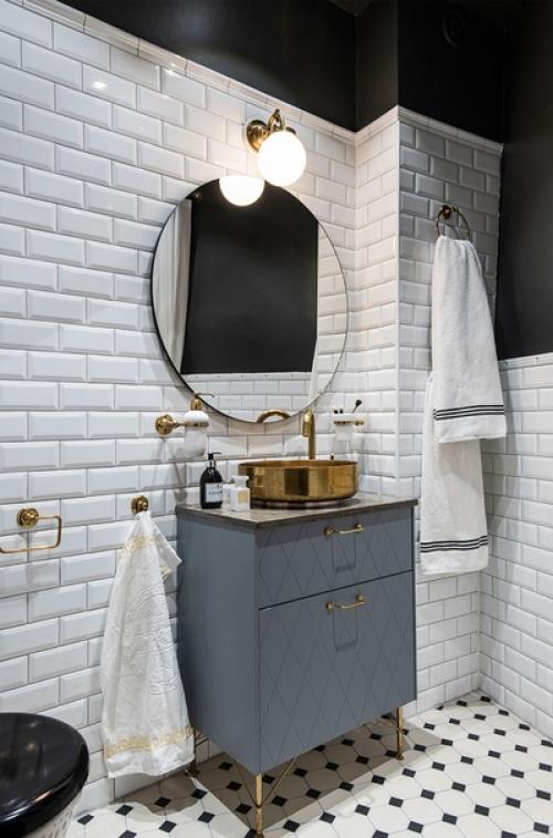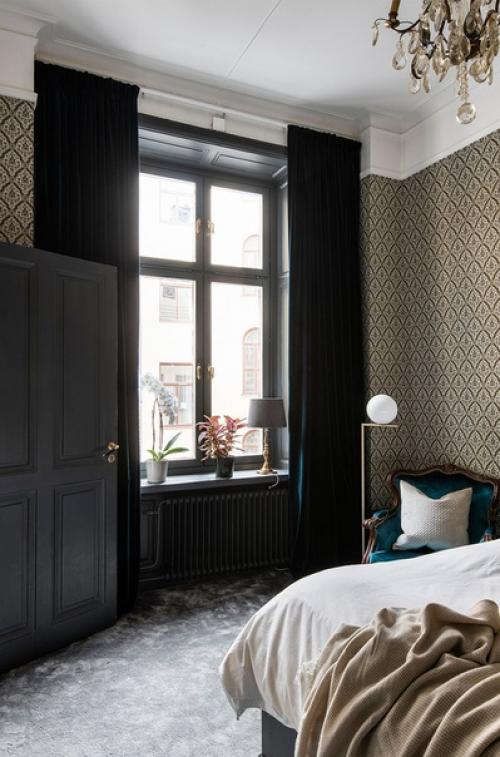 В этой небольшой квартире в 100-летнем доме дизайнеры сделали ставку на обильный классический настенный декор из молдингов и панелей, выполненный в контрастной черно-белой гамме для придания характера интерьерам. В целом можно отметить, что классические предметы преобладают в этом дизайне: обои и кресло в спальной, зеркало в золотой раме в гостиной, винтажные вещички по всему дому. В то же время, типичных современных скандинавских элементов здесь также достаточно . Яркий микс истории и современности!