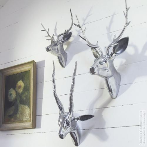 Посмотрите прикреплённые картинки - там куча примеров такого "Рогатого Декора" в интерьере. Можно украсить и гостиную, и спальню, и даже детскую (плюшевые головы на 5 фото классные, да или пугают).