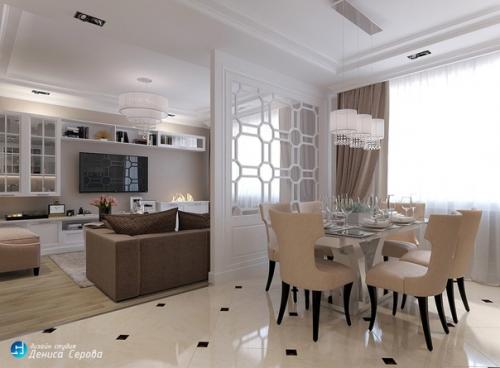 Интерьер не нагруженный. Цвета близки к кофейно - монохромной гамме. Мы в этом проекте современные мотивы и классические элементы совместили.