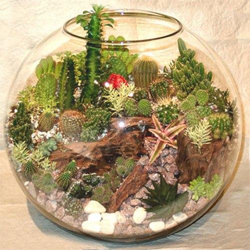 В условиях небольших квартир флорариум достойной заменой громоздким оранжереям станет. Благодаря закрытому пространству, в нем поддерживается особый микроклимат, благоприятный для роста и развития многих растений. За стеклом можно воссоздать кусочек тропического леса, скалистый или пустынный ландшафт.