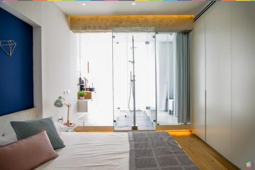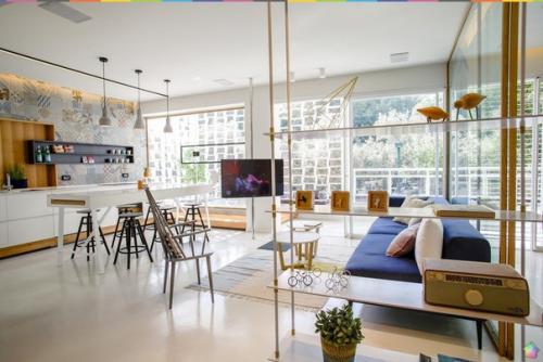 . Архитекторы перенесли кухню, которая теперь является частью дневной зоны открытого плана, а в противоположной стороне квартиры расположили две спальни. За стеклом в гостиной спроектирован кабинет, а рядом обустроена терраса.