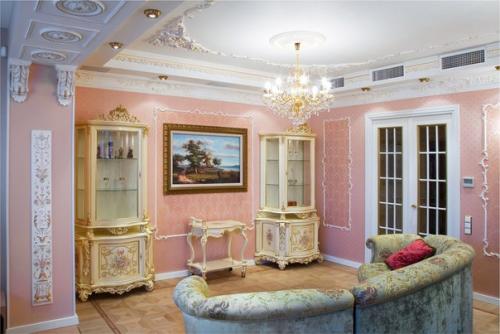 С желанием получить помещение в стиле из прошлых столетий, стоит детально отнестись к размещению лепнины и декоративных ниш. В этом отлично поможет выбранный стиль дизайна интерьера - рококо. Именно за счет него можно получить линии и плавные формы перетекания потолка в поверхности стен. Размешенные молдинги и выполненные филигранно участки стыковки, должны быть выполнены с применением лепнины. Также в таком стиле будут актуальные пурпурные или фиолетовые оттенки колеровки стен.