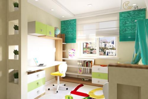Задача этой комнаты (в однокомнатной квартире) сложная: необходимо было совместить детскую зону (спальную, рабочую, . ) и зону (спальную, отдыха) для родителей + возможность принимать гостей! Необходимо было создать комфортную обстановку для всех членов семьи: и в плане зонирования, и в цветовом решении! По моему все задачи были выполнены.