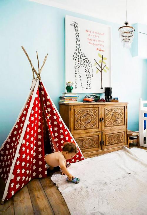 В этом случае простая стремянка будет выполнять функцию шалаша. Потребуется всего лишь поставить стремянку в удобное место для игр и повесить на нее ткань. Этот вариант сооружения отличается мобильностью, так как стремянку можно переносить как во двор, так и в дом.