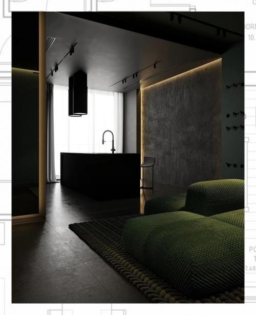 Яркий акцент зеленого цвета в темном интерьере делает квартиру интересной и необычной. Автор проекта - Igor Sirotov Architecture.