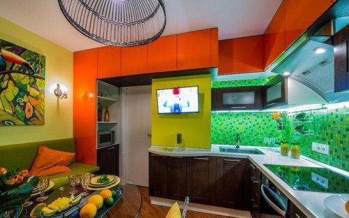 Оформить кухню - нишу в малогабаритной квартире можно по-разному. Многие предпочитают выполнять ее в том же стиле, что и основное помещение, хотя что касается отделки стен и пола, их можно сделать в контрастных тонах, чтоб кухня и зал не выглядели одинаково. В том случае, если использовать в дизайне кухни более приглушенные тона - это поможет как бы спрятать ее, сделать не такой заметной, как основную комнату. Можно, наоборот, выделить кухню - нишу при помощи ярких, сочных, светлых оттенков.