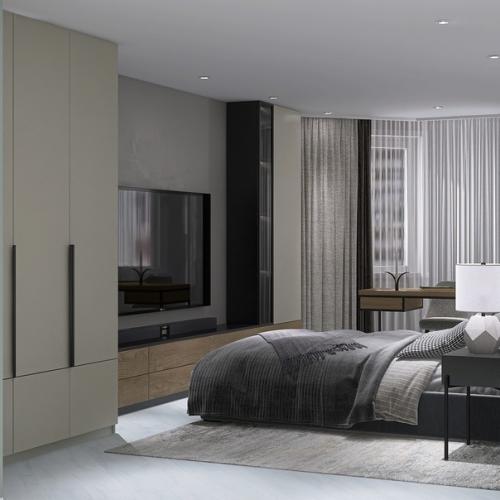Хозяин квартиры попросил расположить в своей комнате кровать, большой телевизор, вместительный шкаф, рабочее место. Так же ему очень хотелось избавиться от трех отопительных стояков. Но убрать их конечно же нельзя, поэтому трубы спрятались в шкафы. Для того, чтоб пространство не выглядело загроможденным обилием корпусной мебели, было принято решение часть их сделать с открытыми полками.