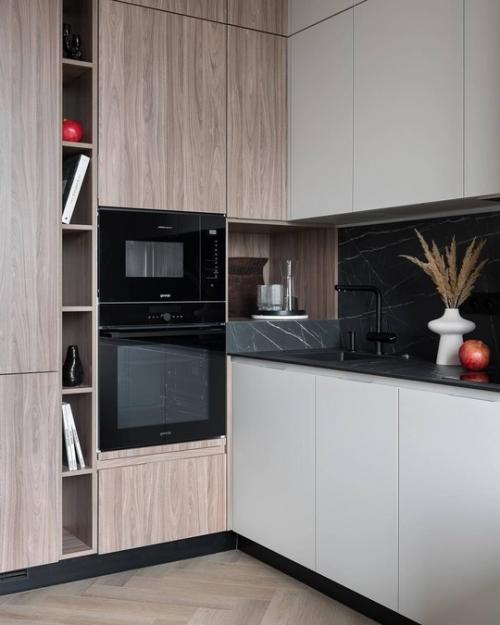 Интерьер в бежево - коричневой гамме, с камином, диванной зоной, вместительными местами хранения, отдельной спальней.