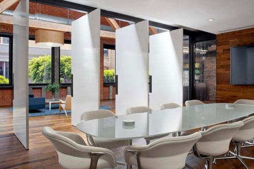Оригинальные архитектурные элементы здания дополнены стальными балками и конструкциями, отделкой и предметами декора из натурального дерева, рифлеными стеклянными панелями, а также стильными предметами дизайнерской мебели. Магнитные белые доски и специальные панели, на которых дизайнеры могут записывать креативные идеи, придают интерьеру особую непринужденность.