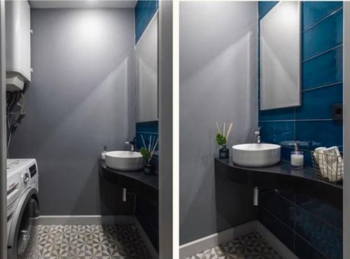 Для воплощения всех пожеланий заказчиков, в квартире сделали перепланировку, благо, стена между комнатой и кухней не была несущей. В результате, на небольшой площади автору проекта удалось разместить: спальню, кухню - гостиную, гардеробную и постирочную.