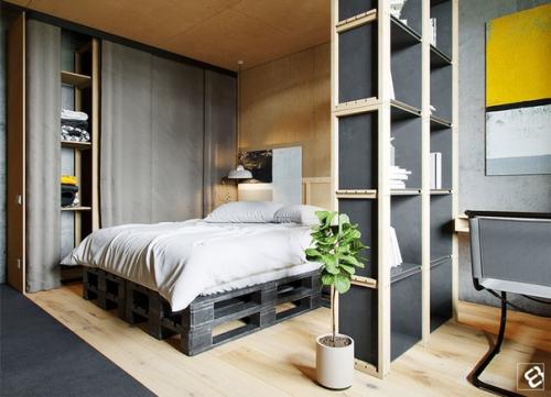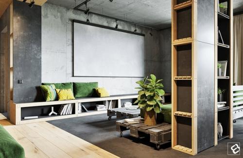 Нетривиальным решением стала неповторимая мебель из паллет: это и диван в гостиной, и журнальный столик, и даже кровать. Зонирование квартиры подчеркивает освещение и цветовая гамма отделки стен и пола вдохновение@Kitcheneco.