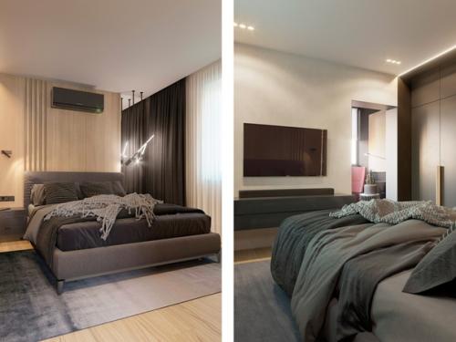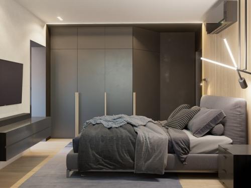 В этой спальне каждая деталь продумана и находится на своем месте. Большой шкаф, выкрашенный в цвет стен, в интерьере был визуально выделен в отдельную зону - с помощью контраста темных и светлых участков стен, а также светодиодной подсветки.