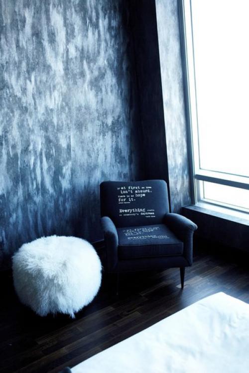 . В гостиной итальянскими обоями Yolo создан эффект осыпающейся штукатурки. Стеганый кожаный диван Baxter привносит в интерьер элемент современного барокко, а кофейный столик, выполненный по индивидуальному заказу, довершает ощущение грубой роскоши. Декор спальни - это современная трактовка готического гранджа. Обои - фрески от Irish Maschek в освещенной нише и люстра Abigail Abern - настоящие произведения искусства. Металлизированные обои Vahallan подчеркивают изголовье кровати в спальне для гостей, также оформленное обоями от Irish Maschek. Кровать цвета фуксии - яркий цветовой акцент на фоне мрачного помещения. Рассеянный свет от ночников в индустриальном стиле завершает образ спальни в стиле готического гламура.