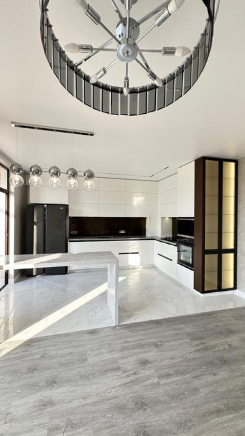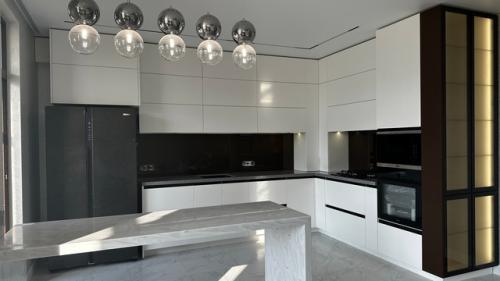 Белые фасады из крашеного МДФ, тёмно-серая столешница из кварцевого агломерата и стеновая панель из тёмно-коричневого калёного стекла создают невероятно стильный и современный ансамбль.