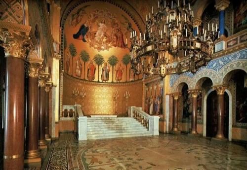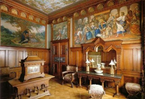 . Окна, выступы свода, колонны и капителии выполнены из мрамора, привезенного из-под Зальцбурга. Из архивов архитекторов известно, что при строительстве замка было использовано 465 тонн мрамора, 1550 тонн песчанника, 400 тыс. Кирпичей и 2050 метров кубических древесины. Король Людвиг был благодарным почитателем культуры, исскуства и творчества Рихарда Вагнера, всемирно - известного композитора, которому он лично оказывал поддержку. Нойшванштайн был отчасти возведён и в его честь. Интерьер многих помещений замка атмосферой вагнеровских персонажей пропитан. Нойшванштайн стал прототипом замка спящей красавицы в парижском диснейленде, источником вдохновения Чайковского для балета "Лебединое Озеро" и воплощением преданной любви Людвига II к музыке и операм Вагнера. Третий ярус замка наиболее полно отражает восторженность Людвига к творчеству Вагнера. Зал певцов, который занимает целиком четвёртый этаж, украшен персонажами опер. Говоря литературным языком, нойшванштайн означает "Новый Лебединый Замок" по аналогии с королём - лебедем одним из персонажей Вагнера. Нойшванштайн строился в конце XIX века во время, когда замки уже утратели свои стратегические и оборонительные функции. В то время как нойшванштайн выглядел подобно средневековый замок, внутри он был оборудован в соответствии "Трендовым" технологиями того времени. Например, на каждом этаже замка "wc Rooms" были снабжены автоматическими смывательными устройствами, а во всём замке функционировал, своего рода, "Climat Control" - воздушного обогрева. Вода для снабжения бралась из ближайшего источника расположенного на 200 метров выше замка. Замок расположен в красивейшем уголке баварских Альп на высоком холме, на фоне величественного горного и лесного пейзажа. С высоты холма и из окон замка открывается вид на долину хоэншвангау. Любой посетитель замка может насладиться этими прекраснейшими видами. Расположенный рядом с замком город фюссен также является популярным туристическим местом Германии. Строительство замка началось в 1869 году, и было спланировано на три года для сдачи в эксплуатацию. Но Людвиг II желал, чтобы замок был совершене, поэтому постоянное строительство не закончилось, даже после смерти Людвига в 1886 году. Во внутреннем дворе замка расположен прекраснейший сад. В нем даже имеется исскуственная пещера. Интерьер нойшванштайна также красив и снаружи. Хотя всего 14 комнат были завершены до внезапной кончины Людвига II в 1886, эти комнаты были расписаны волшебными декорациями. Тронный зал был украшен в византийском стиле, с изображением фресок ангелов на стенах. Весьма иронично то, что в тронном зале не было трона, поскольку король Людвиг умер до того, как зал был закончен.