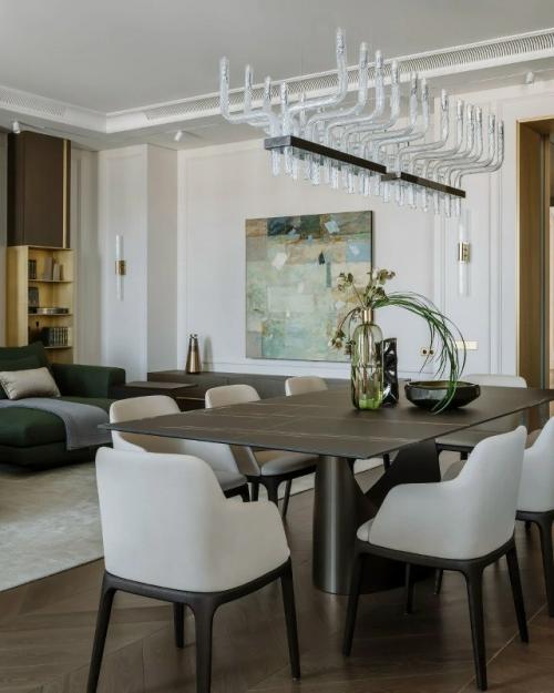 В квартире нет спокойных тонов, нет привычной базы. Здесь оранжевые, розовые, желтые и серебристые поверхности живут наравне с наливными полами пастельных оттенков и блестящими потолками. А мебель - словно арт - объекты, которые легко представить в музее современного искусства.