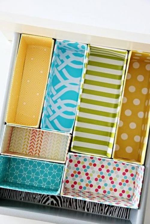 Чтобы сделать хранение в выдвижном ящике более удобным и эргономичным, в него лучше всего поместить специальные разделители. Их продают в интерьерных и мебельных магазинах. Отличной альтернативой им станут обувные коробки. Которые предварительно можно декорировать цветным скотчем.