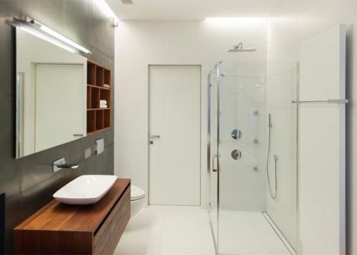 В светлой гостиной внимание привлекают колонна, скрывающая в себе бар, и хозяйственный блок, вмещающий санузел с постирочной, гардероб и функциональные кухонные шкафы. Они в нейтральном серо-зелёном цвете выполнены. Спальная, ванная и детская комната изолированы от основного пространства гостиной зоны и решены в соответствующей общей концепции стилистике.