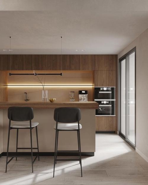 На кухне есть большой центральный остров со встроенной варочной панелью, обеспечивающий достаточно места для приготовления пищи, а гостиная зона предназначена для комфорта и отдыха с мягкими креслами и теплым освещением.