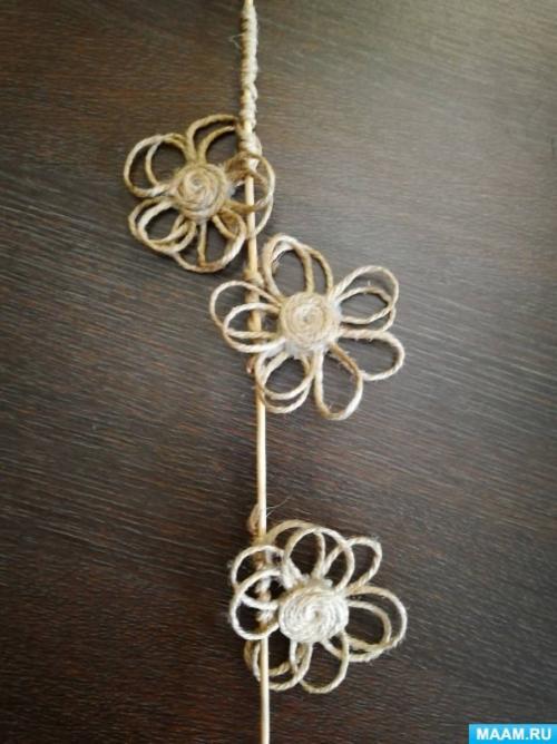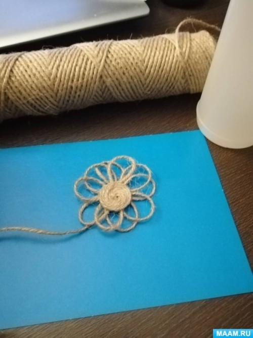 Далее сделаем цветочки из шпагата. Работу необходимо начинать с закручивания «улитки». Создается маленькая петелька и вокруг нее оборачиваются новые круги.