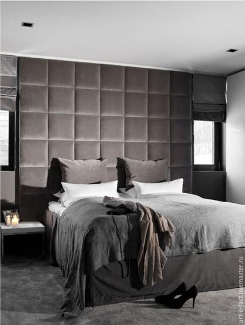 - Наиболее популярным помещением для использования является спальня. Мягкое изголовье, выполненное из нескольких панелей, крепится прямо на стену. А кровать с небольшим изголовьем или без него просто приставляется к стене.