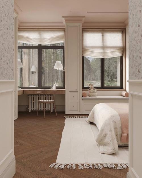 Детская для девочки в загородном доме, с прекрасным умиротворяющим видом за окнами.В этой детской есть еще гардеробная и своя ванная.