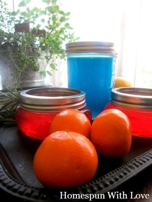 Отличное украшение для кухни, которое очень легко сделать самостоятельно. Для такого ароматизатора нужно приготовить несладкое густое желе на основе отвара из цитрусовых и специй. Когда смесь остынет, добавить в него несколько капель эфирных масел. Залить желе в баночки, вместе с фруктами и специями. Кроме фруктов баночки с желе можно наполнить ветками хвои, шишками и другими природными материалами.