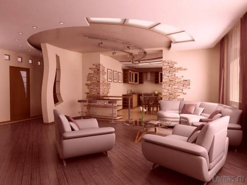 При перепланировке малогабаритки можно сделать квартиру-студию. Зона для приема гостей и отдыха отделяется от кухни передвижной перегородкой. Стеклянная, витражная и зеркальная ширма будет красиво смотреться, зрительно увеличивать пространство.Устанавливается барная стойка, которая делит площадь и используется в качестве обеденного стола.