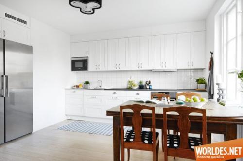 Сегодня нам представлена старая квартира двадцатого века, которая была преобразована в элегантное, ярко оформленное в скандинавском стиле жилье. Квартира довольно просторная и светлая. В ней разместились гостиная, кухня, столовая, три спальни и ванная комната с туалетом. В интерьере преобладают приглушенные цвета с доминирующим белым и серыми акцентами. Всю квартиру объединяет деревянный пол, который является частью интерьера и визуально придает теплоты
