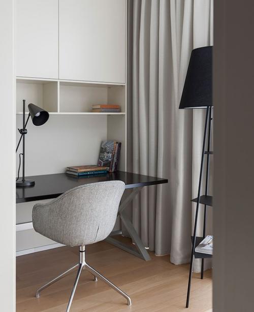 Исходная планировка одну сложность включала. Практически по центру помещения была расположена несущая колонна. В результате конструкцию пришлось спрятать - теперь она находится между прихожей, столовой и гостиной, образуя шкафы во всех трех комнатах. В остальном, глобальную перепланировку не проводили - присоединили к квартире лоджию, разместив здесь кабинет.