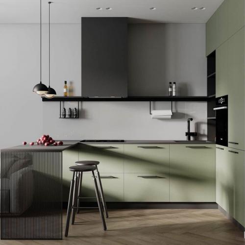 м.Очень интересно получилось сочетать серые оттенки с светло-зеленой гарнитурой кухни.Зеленый цвет добавил акцента и освежил помещение.