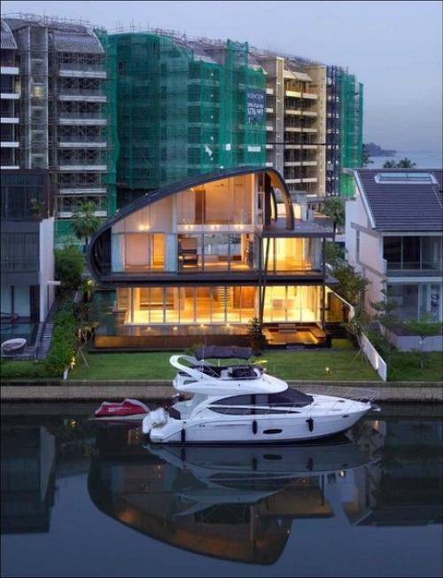 Вашему вниманию предлагается дом на набережной, построенный по проекту Greg Shand Architects в Сингапуре. С извилистой волновой крышей и широкими свесами резиденция морская линия выделяется на фоне современных жилых домов. В то время как одна сторона дома выходит на океан, другая из-за отсутствия вида на море своими изогнутыми элементами действуют как постоянное напоминание о морском характере проекта. Нижняя часть потолка одета во вторичный тик и напоминает корпус лодки